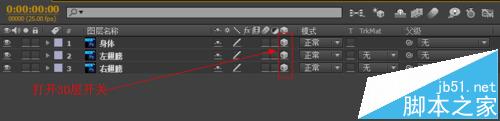 3、如圖示,分別打開三個層的3D層開關,將二維素材轉換成3D層。