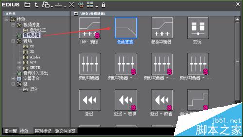 2、打開EDIUS特效面板,點擊“音頻濾鏡”,找到里面的“低通濾波”,并將它拖拽到音頻文件上;
