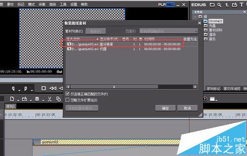 5、如果是挪動了位置的話,在EDIUS時間線上雙擊占位素材。在彈出的恢復離線素材下,點擊高分辨率文件,然后點擊確定。
