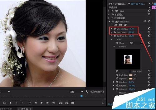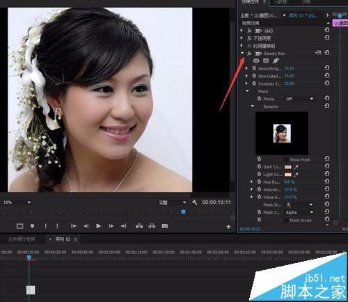 3、打開特效面版 ,找到Beauty Box 插件,把它放入素材的控制面版。可以看到只要把它放進去就可以看到以經(jīng)有光滑的效果了。