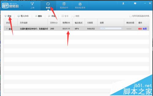 2、點擊藍色區域的轉碼,并點擊左上方的添加,加入自己需要修改的視頻。