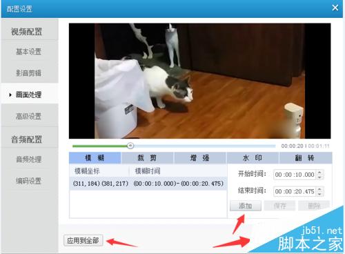 7、我們可以看到添加,和應用到全部,添加意思是,可以無限設置模糊區域,和模糊時長。應用到全部,說的是多個視頻一起去水印,點擊應用全部,第一個視頻的設置,會應用到其它,視頻上,(建議不要用,不同的視頻,水印加的時間,大小不一樣。)設置好之后點擊確定,