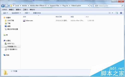 3、插件名稱是 Saber 。那我們就在插件目錄找到該文件。盤符插件路徑目錄../Adobe/Adobe After Effects CC/Support Files/Plug-ins/VideoCopilot/saber.aex