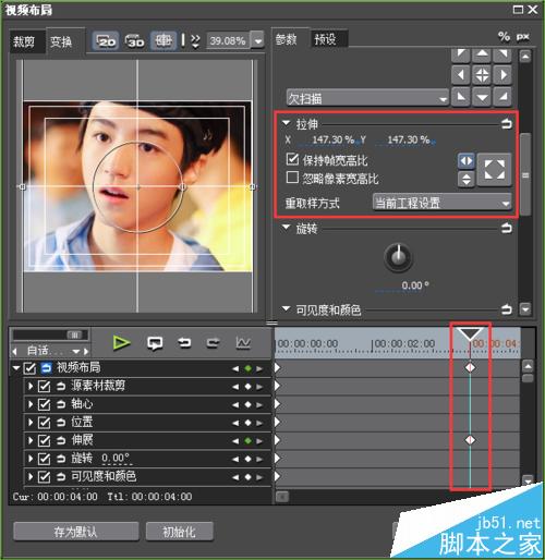 2、在彈出的“視頻布局”對話框中,將時間線移至圖片開始處,勾選上“視頻布局”復選框,并單擊“默認關鍵幀”圖標,此時即添加了一列關鍵幀;