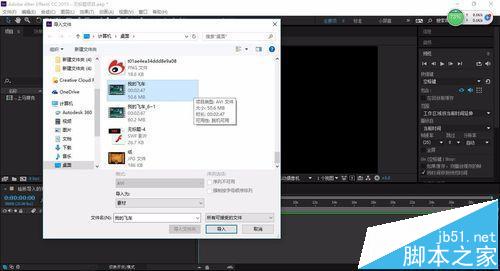 4、打開項目面板,右擊該面板,在彈出的快捷菜單中選擇"導入>文件..."命令或按住Ctrl+I鍵打開【導入文件】對話框,選擇名為"我的飛車"的視頻,單擊"導入"按鈕,即將"我的飛車"視頻導入到項目面板中,如下圖所示。