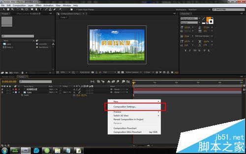 2、在時間線空白處,右鍵找到并打開“合成屬性”。