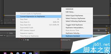 5、選中左邊的關鍵幀(上圖中左邊的黃色菱形按鈕),然后右鍵選擇“Keyframe Assistant(關鍵幀輔助)”下的“Convert Expression to Keyframes(轉換表達式為關鍵幀)”。