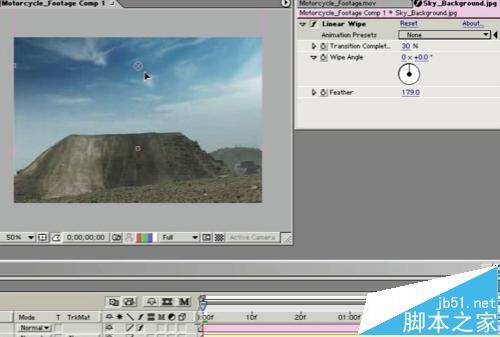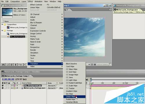 2、將天空的素材放到視頻圖層的上面,添加“線形檫除”效果,根據視頻要求,修改參數