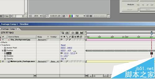 7、回到合成窗口,發現天空素材跟著動了 但是錯位穿幫了,這里就要打開天空圖層的屬性手動調節了,大部分是位移屬性 和縮放屬性