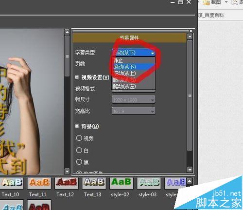 6、將背景屬性中 的字幕類型設置為 爬動(向上)