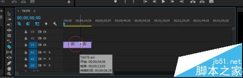 6、使用【剃刀工具】,放在需要裁剪的時間軸區域內,鼠標右擊一次,使需要裁剪的區域變成白色,表示,已經選中該時間軸