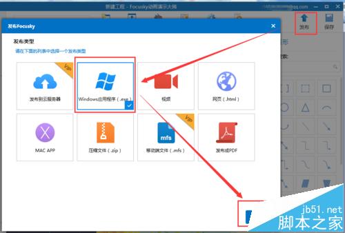 7、最后輸出EXE文件。點(diǎn)擊右上角的“發(fā)布”->“Windows應(yīng)用程序(*.exe)”->“下一步”。然后設(shè)置好一些項(xiàng),最后點(diǎn)擊“發(fā)布”,即可成功發(fā)布單獨(dú)的EXE文件。這個(gè)EXE文件復(fù)制到任何的Windows電腦,都能直接點(diǎn)擊打開,無需另外安裝focusky軟件。