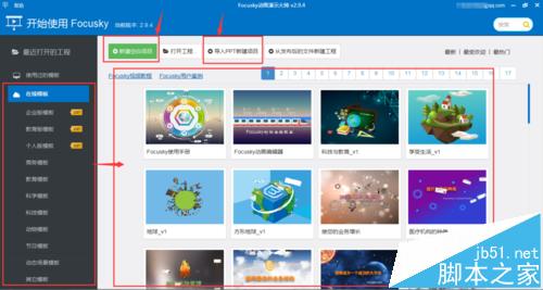 4、我們?cè)诮缑嬉姷接性S多各類模板,可以點(diǎn)擊喜歡的模板進(jìn)行應(yīng)用;也可以點(diǎn)擊“新建空白項(xiàng)目”;或者點(diǎn)擊“導(dǎo)入PPT新建項(xiàng)目”。