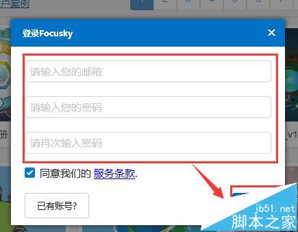 3、安裝完畢后,打開focusky軟件,我們注冊(cè)個(gè)賬號(hào),如圖,點(diǎn)擊右上角的“登陸”->“沒有賬號(hào)”,然后輸入郵箱、密碼,進(jìn)行注冊(cè)。注冊(cè)完畢即可登陸,正常使用。