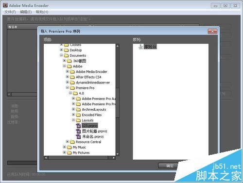 4、現在打開添加,添加你的工程文件,如圖所示。ae cs4的文件也可以從這里導入,pr的序列文件后綴為.prproj