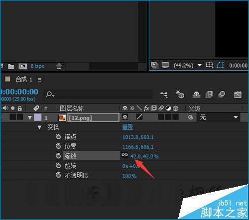 8、這里把它的縮放值調(diào)整到一個(gè)想要的合適的數(shù)值。這里在把它的縮放值更改為42左右。這時(shí)就可以看到現(xiàn)在在界面中的素材就是按著自己所移動(dòng)的錨點(diǎn)的位置來進(jìn)行縮放。掌握了移動(dòng)的方法就可以把錨點(diǎn)按著效果來進(jìn)行移動(dòng)操作。