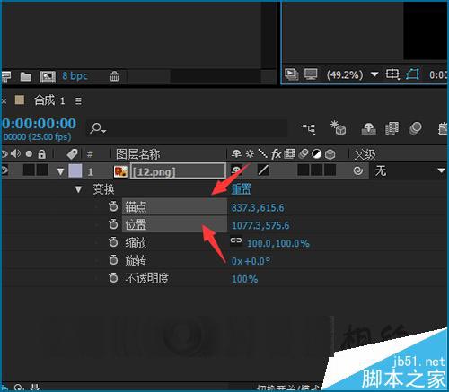 7、移動(dòng)之后,就可以在素材的屬性列表中看到現(xiàn)在是同時(shí)選中了錨點(diǎn)和位置。因?yàn)樵谝苿?dòng)素材的錨點(diǎn)同時(shí),素材的位置也跟著發(fā)生了變化。接下來就可以來調(diào)整一下它的縮放值。