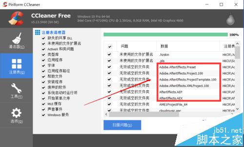 1、如果是之前通過其他方式卸載過,重新安裝時無法安裝的情況下,說明你沒卸載干凈。打開CCleaner軟件點“注冊表”——“掃描問題”就會發現還有很多AE程序沒有卸載掉。