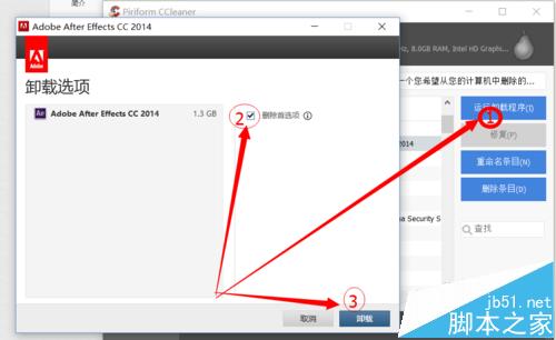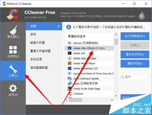 2、打開軟件“CCleaner”。選擇左邊的“工具”在要刪除的程序下面找到你要卸載的AE版本,我這里演示的是卸載2014的CC版本。