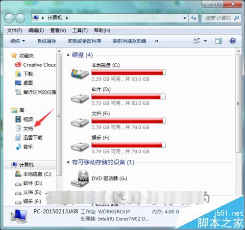 2、雙擊打開電腦桌面上我的電腦或我的計算機。在彈出的界面中選擇左邊庫列表中的文檔。
