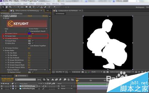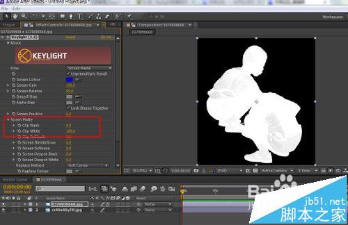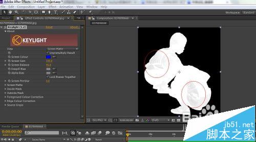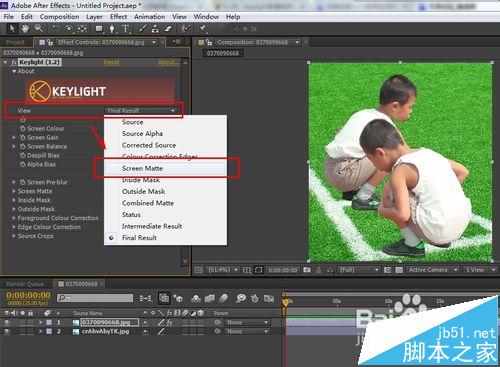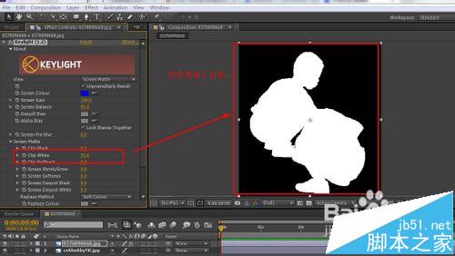 4、進一步使用keylight修改摳圖的細節。上面的例子比較簡單,顏色對比非常的明顯,有時候我們的背景的飽和度不同,這時就需要我們進一步進行調整。切換查看模式——屏幕蒙版模式。這時的素材就會變成黑白灰三種顏失色: