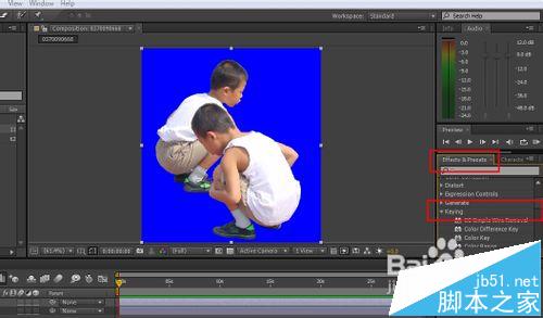 2、為素材添加keylight特效。選擇需要進行摳圖的素材,在右側的特效與預置中選擇鍵控——在選擇里面的keylight效果即可,然后將keylight效果添加到合成上,添加方法直接拖拽到合成上即可。