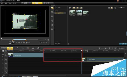 4、暫時(shí)把后半段素材,拖放到覆疊軌上面,讓其和前面的素材空開一段距離。