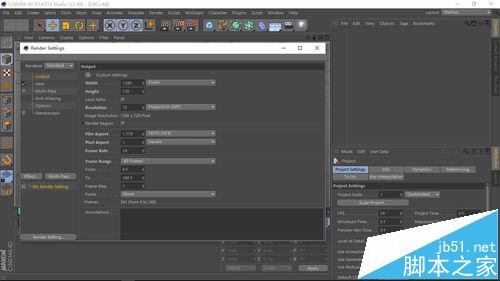 5、Ctrl+B打開渲染設置面板,點擊Custom Settings左邊的箭頭,選擇一個1280*720的尺寸,Frame Rate同樣匹配為24幀,Frame Range設置為All Frames共240幀即10秒。