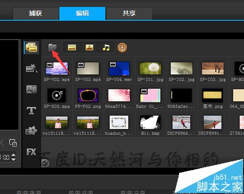 1、這里需要先把用到的素材直接導入到素材面板中。在軟件的界面右邊的素材面板中有一個文件夾的標志。這里可以直接先把素材通過這個文件夾打開后放到素材面板中,而不直接拉入到軌道中使用。這樣對于素材的使用也更方便。