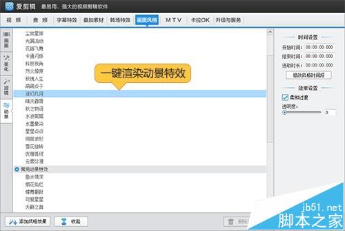 在“畫面風格”面板,其左側(cè)“畫面”欄中,選擇 “自動縮放”、“沿垂直中軸轉(zhuǎn)動” 、“沿水平中軸轉(zhuǎn)動”、“向上擺動”等獨特的畫面效果。
