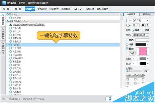 在“字幕特效”面板,鼠標雙擊右側(cè)的視頻預(yù)覽框,輸入片尾字幕,在左側(cè)字幕特效列表中,勾選你喜歡的字幕特效。軟件自帶了沙礫飛舞、火焰噴射、繽紛秋葉、墨跡擴散、風中音符等大量頂級的好萊塢字幕特效,能讓你的視頻效果增色不少!