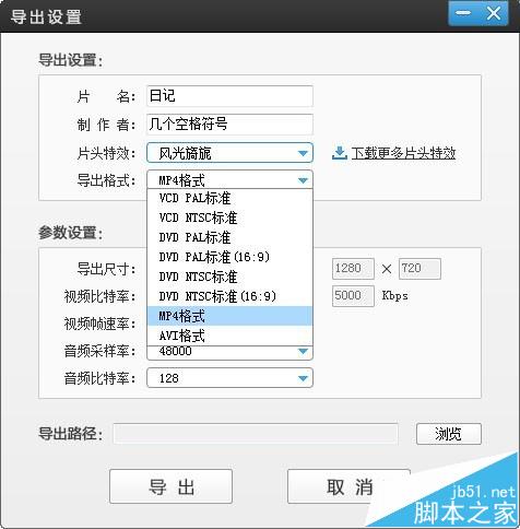 軟件支持導出AVI、MP4、DVD等格式,點擊視頻預(yù)覽框右下角的“導出視頻”按鈕,在“導出格式”下拉框中,建議選擇MP4導出格式,把“導出尺寸”設(shè)為720P或1080P,并將“視頻比特率”設(shè)為3500kbps以上(比特率越大,畫質(zhì)越好),這樣就可以在網(wǎng)上分享我們這個高清標準的視頻了!