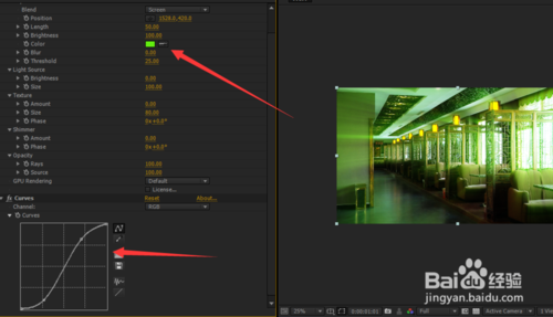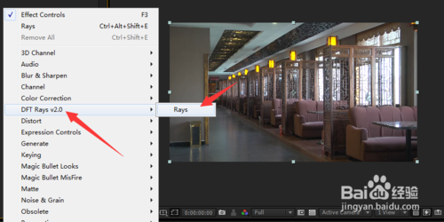 5、我們找到適合做光線的素材,在特效面板上選擇DFT Rays——rays,選擇之后我們就可以看到效果了,我們在調動上面的參數,讓他達到你想要的效果!
