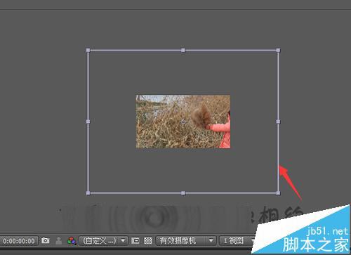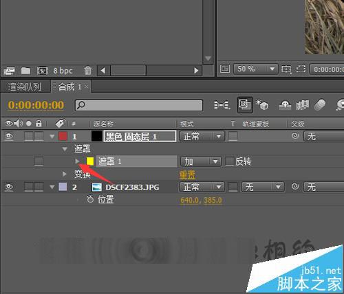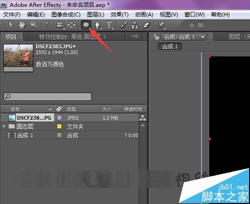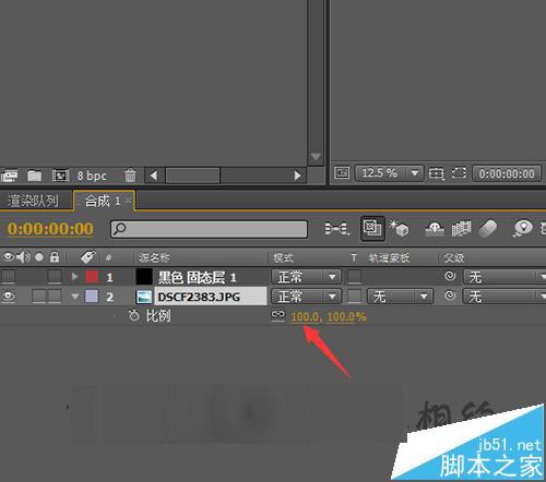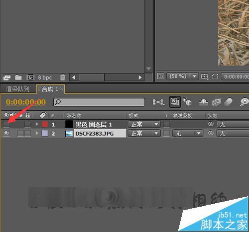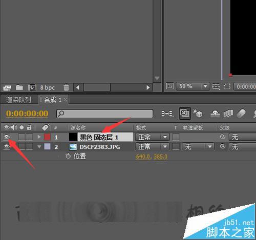 4、直接把相片拉入到下面的合成中。把相片放到固態(tài)層的下面。先把固定層關(guān)閉后需要看一下相片的大小是否合適,如果相片過(guò)大的話(huà),就需要把相片進(jìn)行一個(gè)縮小的操作。