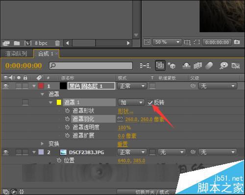 9、當(dāng)調(diào)整數(shù)值后,可以在預(yù)覽窗口中看到現(xiàn)在它的位置是在中間,并不是想要的效果。這里點(diǎn)擊遮罩后面的反轉(zhuǎn)。把它的位置和原來(lái)的正好相反。