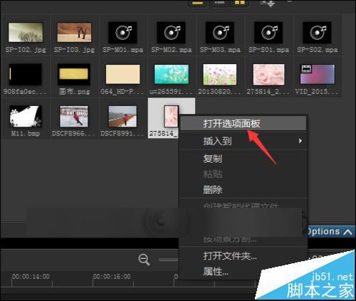 2、直接在素材上面進行操作。在素材面板上面,選擇這一張圖片。在圖片上面點擊右鍵。在彈出的列表中選擇打開選項面板。