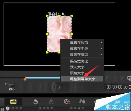 4、在覆疊軌上面進行操作。把素材拉入覆疊軌上面。選中覆疊軌上面的圖片素材。在窗口的界面中在圖片上面點擊右鍵,在列表中選擇高速到屏幕大小。