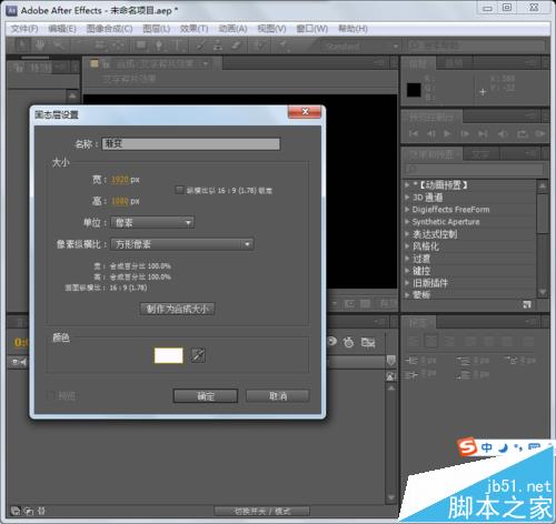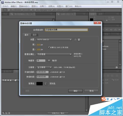 1、打開AE,新建合成。執行菜單中的合成 新建合成命令,打開合成設置對話框,設置合成名字為“文字碎片特效”,幀速率為25,設置持續時間為0:00:03:00.