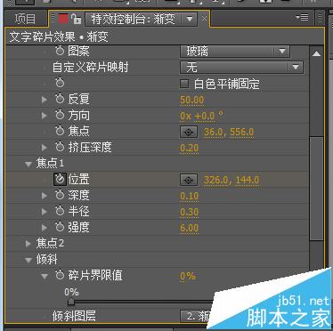 (4) 展開漸變選項,將漸變圖層下拉菜單改為2.漸變,設置爆炸極限為0%,將時間線放置零幀(0:00:00:00),點擊位置爆炸極限前面的碼表,設置關鍵幀。