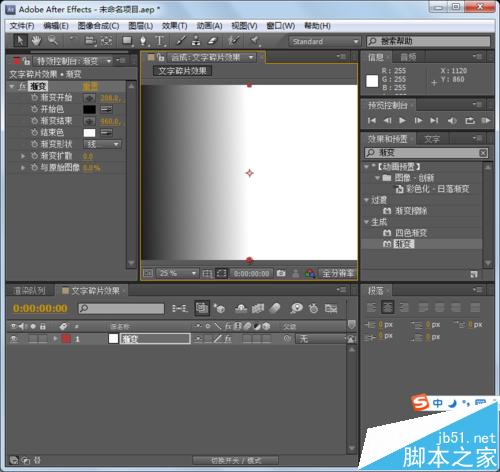 3、添加漸變特效,修改其參數。執行菜單中的特效創造漸變命令, 在對其進行參數修改.設置漸變起始點為漸變結束點為(-14,144)具體參數大家可以根據需要自行調整。