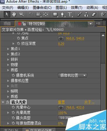 6、將時間調到3秒(0:00:03:00)的位置,在特效控制面板中設置位置為(326,144)爆炸極限為100%