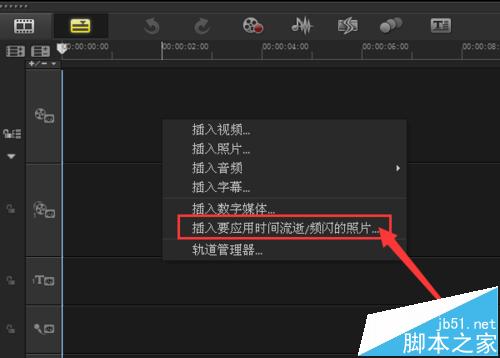 2、打開會聲會影X7軟件,鼠標在軌道上右鍵,彈出一個菜單,點擊插入要應用時間流逝/頻閃的照片,如圖所示。