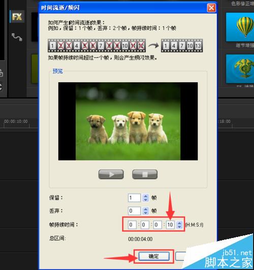 4、這時會彈出時間流逝/頻閃窗口,我們把原來的幀持續(xù)時間1幀,改成10幀,然后點擊確定,如圖所示。