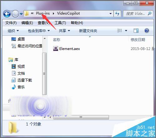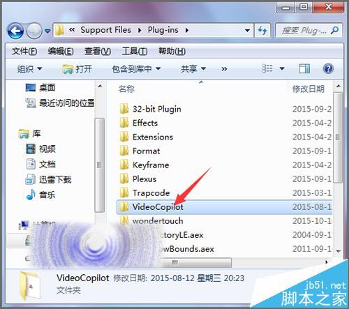 6、打開Plug-ins的文件夾后,在它的列表中找到Video copilot文件夾并打開。打開之后,在它的列表中并沒有Optical Flares插件, 就需要在其它的文件夾中繼續找。點擊地址欄的上面,回到Plug-ins的文件夾。
