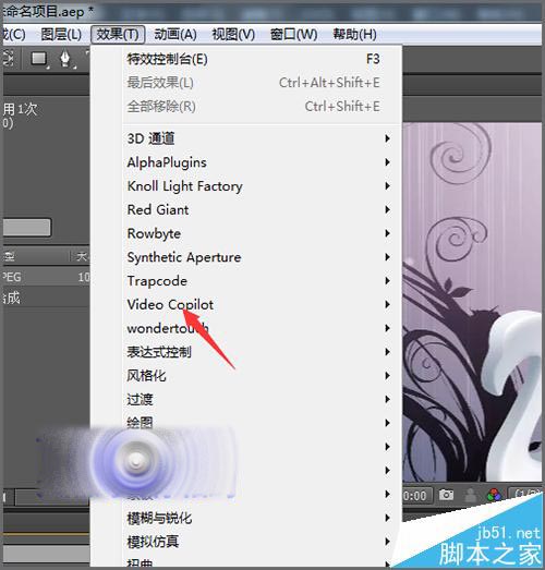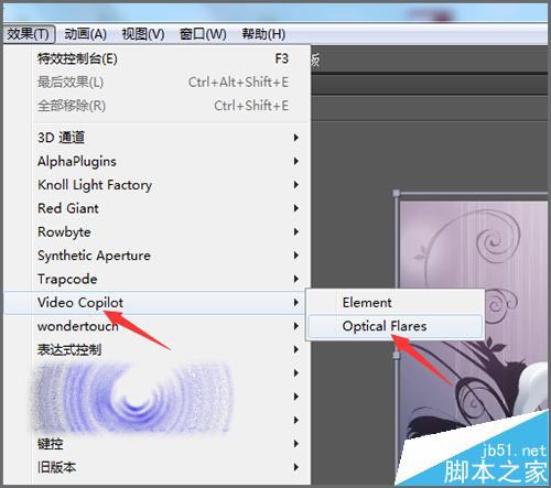 2、這里先要在它的特效列表中找到它是在哪個文件夾中。在軟件中新建一個合成,然后隨意的拉入一張圖片到合成中后,再點擊特效菜單。這時在彈出的列表中找到Optical Flares插件的位置。是在哪個文件夾中的,就可以在這個文件夾中找到這個插件。