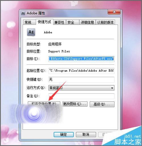 4、在桌面上ae的桌面圖標上面點擊右鍵。在它出現的列表中選擇最下面的屬性。接著在彈出的屬性界面中點擊打開文件位置。