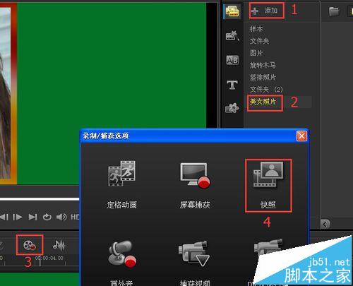 6、然后點媒體,再點擊添加,創建一個文件夾,起名美女照片。再點擊錄制/捕獲選項,在彈出的窗口中,點擊快照,這樣一張帶漂亮邊框的圖片就做好了,如圖所示。