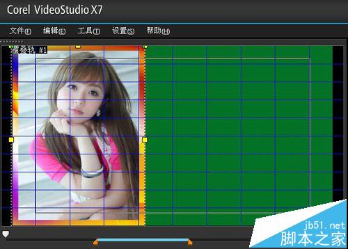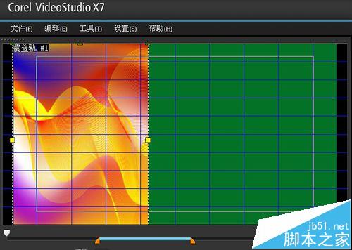 2、打開會聲會影,把10張照片和一張風景圖導入到素材庫,然后我們給相片添加五彩邊框,首先打開軌道管理器,添加2條覆疊軌,然后從圖形里拖一張綠色塊到視頻軌,調整到屏幕大小,我們把背景圖拖到覆疊軌,在屬性里顯示網格線前面打勾,把背景圖調整好位置,如圖所示。