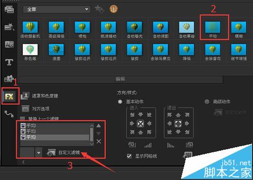 4、我曾經在前面的經驗中講過“利用會聲會影給照片添加漂亮的邊框”,這次給相片添加五彩邊框方法是一樣的,點擊FX濾鏡,找到平均,拖拽到覆疊軌背景圖上,然后點屬性,點自定義濾鏡,新窗口中方格大小拖到50,然后點擊確定,這樣的操作重復3次,如圖所示。