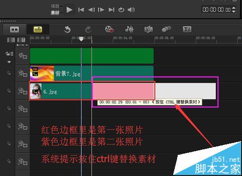 7、按住鼠標左鍵,托拽另一張美女照片到覆疊軌的第一張照片上,使其重疊一部分,右手按鍵盤上的ctrl鍵替換第一張照片,然后點錄制/捕獲選項,再點快照,這樣第二張帶漂亮邊框的照片也做好了,如圖所示。